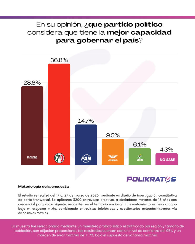 El liderazgo del PRI en este indicador sugiere una valoración positiva de la experiencia institucional o un contraste frente a la gestión actual. Llama la atención el bajo porcentaje de indecisos (4.3%), lo que indica una opinión pública altamente polarizada y definida respecto a quién consideran apto para llevar las riendas del país.