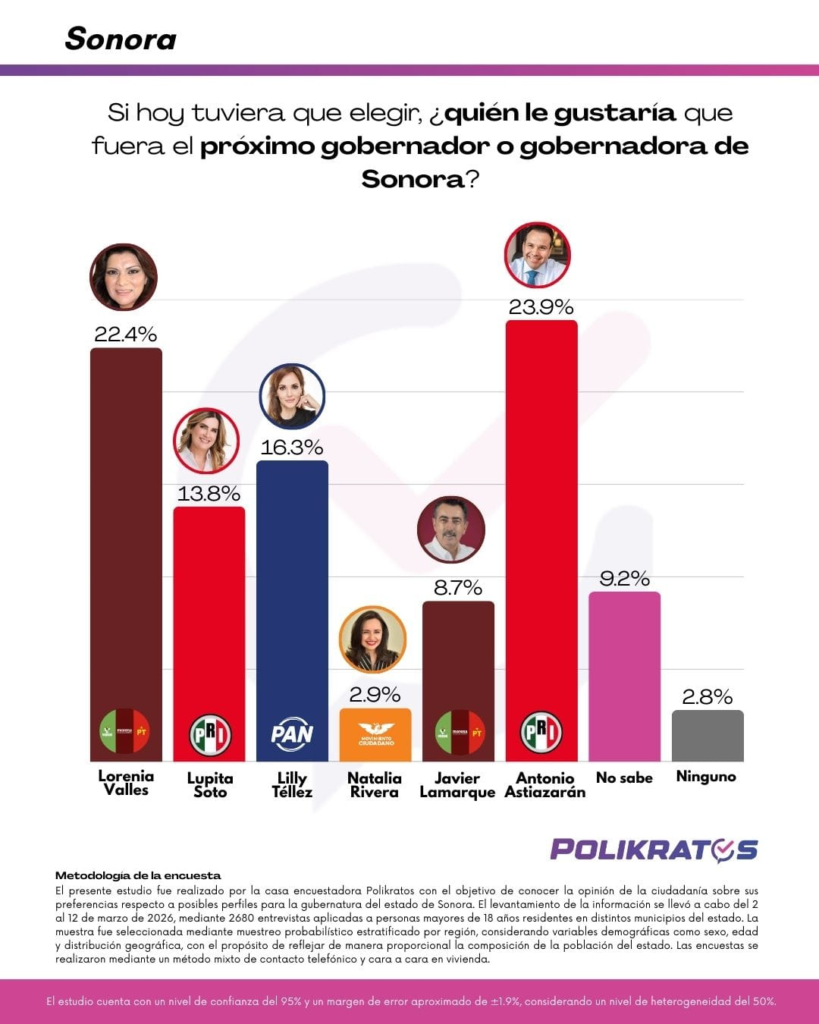 El más reciente estudio de opinión pública de la casa encuestadora Polikratos, realizado durante la primera quincena de marzo de 2026, ofrece un panorama detallado sobre la intención de voto en Sonora. Los datos revelan una contienda donde las trayectorias legislativas, administrativas y de partido comienzan a pesar en la percepción ciudadana, configurando una competencia de tercios.