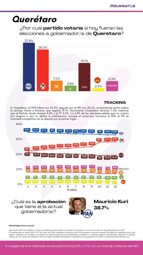 El más reciente estudio de opinión pública de la casa encuestadora Polikratos revela una contienda cerrada por la gubernatura de Querétaro. Los resultados del seguimiento histórico (tracking) muestran una reconfiguración de la intención de voto que destaca por el crecimiento sostenido del bloque opositor tradicional y una estabilización de las fuerzas de izquierda.