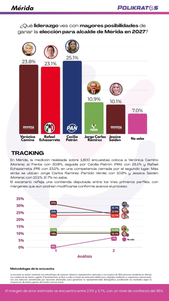 La encuesta se realizó mediante un muestreo aleatorio representativo de 1,800 personas residentes en Mérida. El levantamiento incluyó entrevistas telefónicas y digitales bajo un esquema estratificado. El margen de error se sitúa entre el 2.5% y 3.7%, con un nivel de confianza del 95%.