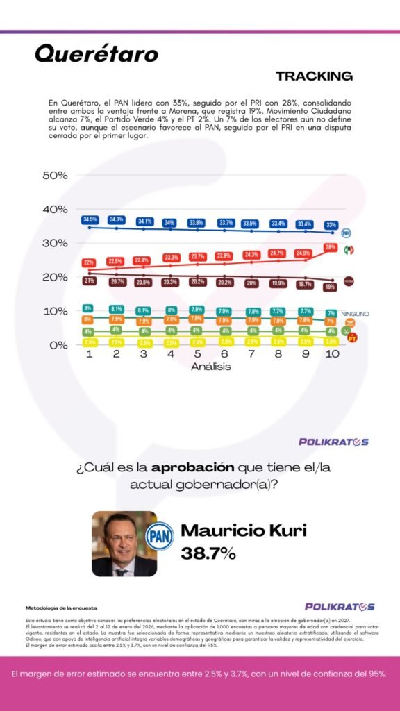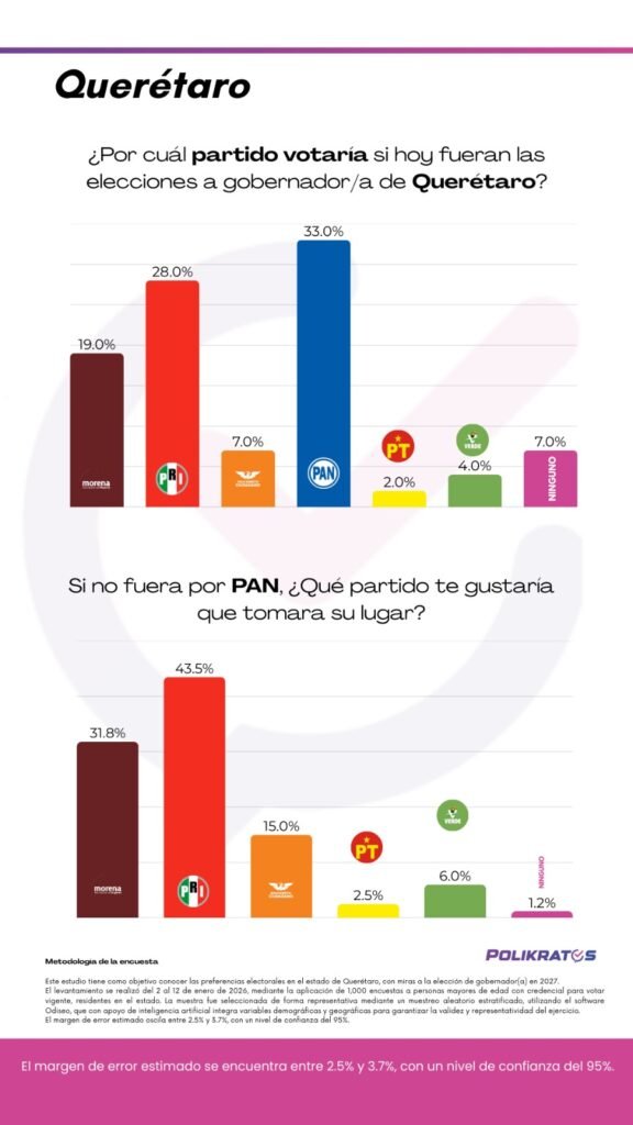 Ficha Técnica: Estudio realizado por Polikratos del 2 al 12 de enero de 2026. Muestra de 1,000 encuestas estratificadas a ciudadanos con credencial vigente en Querétaro. Margen de error: entre 2.5% y 3.7% con un 95% de confianza.